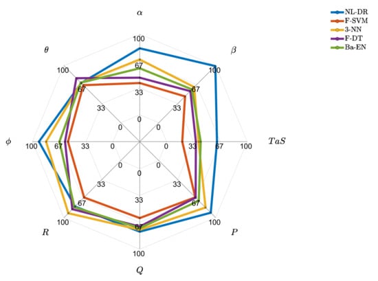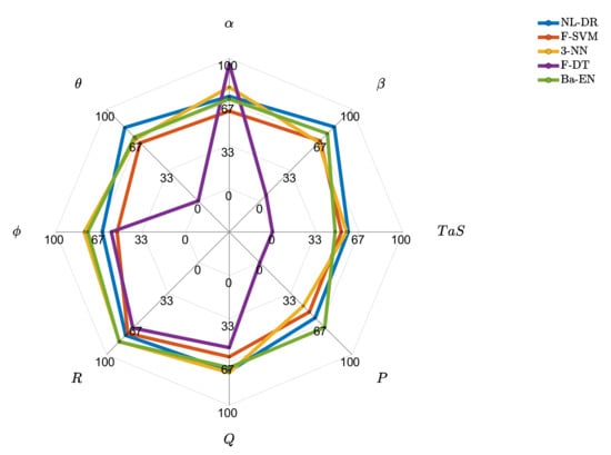 To better compare the overall performance, Table 8, Table 9, Table 10, Table 11, Table 12, Table 13, Table 14 and Table 15 report, for each monitored sensor, the percentage ratio between the actual area below the function (as those in Figure 5 and Figure 6) and the perfect performance area (). The ideal area ratio is obviously 100%. The same process is also applied to the functions. The last column of the tables reports the mean between the area ratio and the area ratio.
