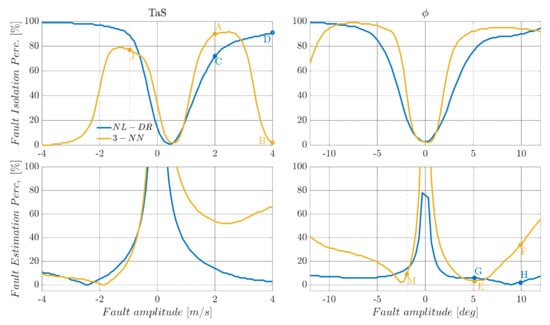This section evaluates and compares time domain FI and FE responses for the NL-DR and 3-NN2 techniques. In order to achieve a meaningful comparison, the tests are performed by selecting faults whose amplitudes are such that the two methods provide the same value for the or the indices in Figure 5 and Figure 6, resulting in the selection of a fault of the amplitude of 2.5 m/s on , and of on , respectively (as expected, the faults are injected at and the constants for the whole flight are maintained).