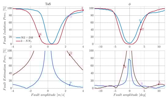 For validation and comparison purposes, additive constant bias faults of amplitude () are considered. The constant fault is applied at time and is maintained for the entire duration of the validation flight. The following FI and FE metrics are used.