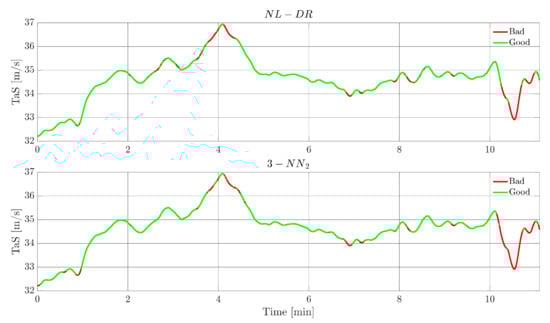 Figure 7 shows, for a failure on TaS, the evolution of this signal. The green portions indicate the instants in which the FI is correct, while the red portions indicate when the failure is incorrectly attributed to a ‘wrong’ sensor. The upper plot refers to the NL-DR technique, while the lower plot refers to the 3-NN2 technique. For hypothesis, both methods isolate the fault with the same percentage (82%, Point O in Figure 6); the remarkable aspect is that the zones of wrong isolation are practically the same for the two techniques.