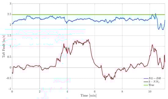 TaS sensor FE performance for a fault amplitude of 2.5 m/s (green line) during the test flight. The blue signal indicates the fault amplitude estimated by the NL-DR technique, while the amaranth signal indicates the fault amplitude calculated by the 3-NN2.
