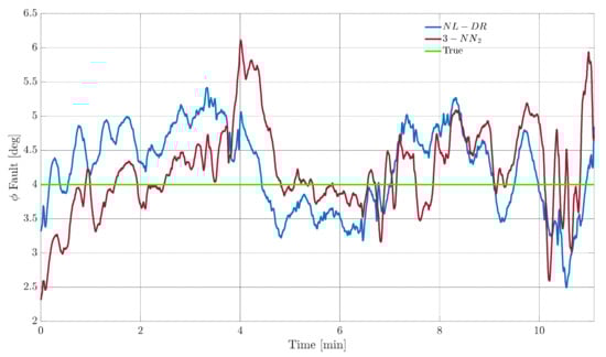 A similar analysis is then performed for the fault on the sensor . In this case, however, the fault amplitude is selected to be 4°, i.e., the point R of Figure 6 where the index is equal to 6% for the two techniques. Figure 9 shows the evolution of the estimation of the fault amplitude for the two techniques, where it is confirmed that the performances are equivalent for all practical purposes. On the other side, from Figure 10, it can be observed that the performance of the NL-DR technique is significantly better than that of the 3-NN2 technique (Points S and T in Figure 6).