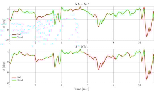 φ sensor FI performance for a fault amplitude of 4° during the test flight. The green segments indicate when the fault on the φ sensor is correctly isolated by the FI scheme, while the red segments indicate a wrong FI.
