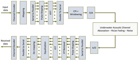 Underwater communication plays an important role in various offshore applications including remote monitoring, fishing industry, exploration, search and rescue, surveillance, and border safety to name a few []. Acoustic signals have widely been used since they do not suffer from absorption and scattering the way radio waves and light waves suffer. Low speed of sound severely limits the bandwidth at which the data transmission can take place []. A larger delay spread causes inter-symbol-interference (ISI) and even a small change in the position of transmitter and receiver causes Doppler shifts making the channel doubly selective []. Multipath properties of the channel vary according to the geometry and physical conditions such as the transmitter-receiver position as well as the sea surface and boundary. With the ever-increasing demand for high data-rate multicarrier acoustic communication, OFDM has widely been studied [,,,]. It can effectively counter ISI due to a longer symbol period. However, OFDM suffers from a high PAPR and high OOB emissions which makes it less efficient [].