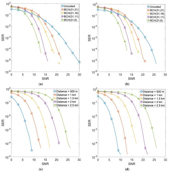 Figure 3 shows the error performance of the BCH encoded GFDM scheme. Figure 3a shows a comparison of selected BCH encoding schemes, i.e., BCH (31,21), BCH (31,16), BCH (31,11), and BCH (31,6) when matched filter receiver is used for the recovery of the transmitted information and the transmitter-receiver distance is kept at 1000 m. Figure 3b shows a comparison of the same encoding schemes when a zero-forcing equalizer is used at the receiver. Figure 3c,d show the error performance of the proposed system as a function of transmitter-receiver distances. We varied this distance from 500 m to 2.5 km.