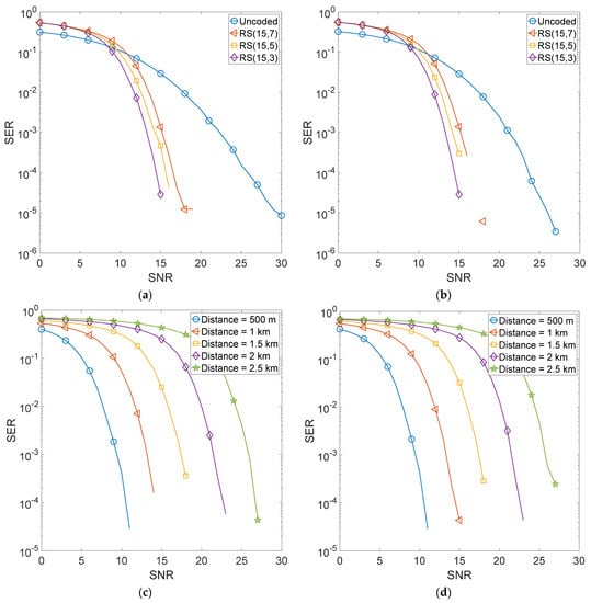 Figure 4 shows the error performance of the RS encoded GFDM scheme. Figure 4a shows a comparison of selected RS encoding schemes, i.e., RS (15,7), RS (15,5), and RS (15,3) when matched filter receiver is used for recovery of the transmitted information and the transmitter-receiver distance is kept at 1000 m. Figure 4b shows a comparison of the same encoding schemes when a zero-forcing equalizer is used at the receiver. Figure 4c,d show the error performance of the proposed system as a function of transmitter-receiver distances. We varied this distance from 500 m to 2.5 km.