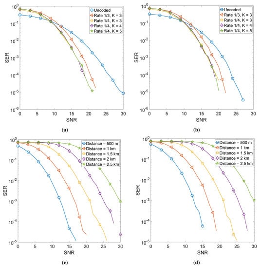 Figure 5 shows the error performance of four convolutionally encoded GFDM schemes. Figure 5a shows a comparison of four convolutionally encoded schemes, i.e., rate 1/3 with constraint length 3, rate 1/4 with constraint length 3, rate 1/4 with constraint length 4, and rate 1/4 with constraint length 5. The equalizer employed for the recovery of transmitted information is matched filter and the transmitter-receiver distance is kept at 1000 m. Figure 5b shows a comparison of the same encoding schemes when a zero-forcing equalizer is used at the receiver. Figure 5c,d show the error performance of the proposed system as a function of transmitter-receiver distances when a convolutional code of rate 1/4 with constraint length 5 is employed. We varied this distance from 500 m to 2.5 km.