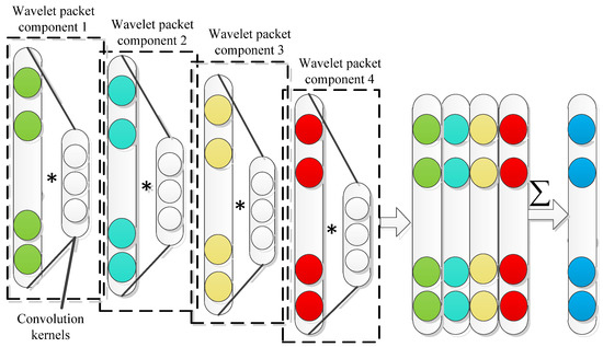 The compressed signal is decomposed by a wavelet packet in the compressed domain to obtain signal components of different frequency bands. Since different frequency bands contain local feature information of signals, if this feature information can be fully utilized, the accuracy of fault feature can be further improved. The obtained information of each frequency band was used as the input signal of the multi-channel convolution layer, which corresponds to the multi-channel convolution kernel. Different convolutions were applied to each channel data for each convolution operation. According to Equation (13), it can be regarded as weighting the signal features of different frequency bands after decomposition. The structure diagram of the fusion layer is shown in Figure 1.