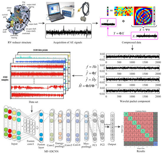 The structure of an RV reducer is complex and has tightly coupled internal parts. In this study, the fault diagnosis of an RV reducer is based on the AE signal of CS. The combination of CS theory and an MF-CNN model can not only effectively solve the problem caused by AE signal data redundancy, but also adaptively select the frequency band features containing the main feature information to avoid the uncertain influence of a subjective parameter setting on the experimental results. The original signal was compressed and sampled, the amount of data was reduced, and then the compressed signal was decomposed by wavelet packet in compressed domain to obtain the information of each frequency band. The obtained information of each frequency band was used as the input signal of the multi-channel convolutional layer. Then the energy pooling layer was used to mine the energy features of each frequency band. It not only solves the problem of a large amount of AE signal data in fault diagnosis, but also solves the problem of weak fault features of CS data. Finally, the softmax classifier was used to classify and predict RV reducers of different fault types. The basic process of AE signal fault diagnosis of an RV reducer is shown in Figure 2.