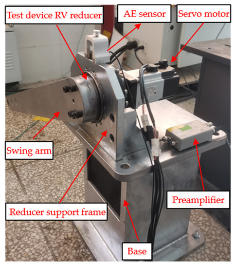 In order to verify the effectiveness of the method proposed in this study, a self-fabricated RV reducer fault test bench was used for experiments. The test bench is shown in Figure 3. The test bench consists of five parts: base, swing arm, servo motor, reducer support frame, and reducer (12 teeth of sun gear and 42 teeth of planet gear).