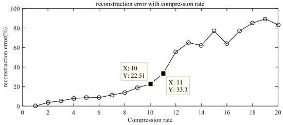 The compression rate is a parameter that measures the amount of compressed measurement signal and reflects the degree of compression of the original signal. The larger the compression rate (R = data length of the original signal/data length after compression), the more feature information loss of the original signal in the compressed domain signal. Therefore, it is very important to choose an appropriate compression rate. In the case of retaining key information, the CS method with an appropriate compression rate can significantly reduce the computational cost. In this study, the discrete cosine transform (DCT) method was used to sparse represent the original AE signal, and the orthogonal matching pursuit (OMP) algorithm was used to reconstruct the signal to study the influence of different compression rates on the reconstruction error. The reconstruction error is defined as . The change trend of the reconstruction error was calculated under different compression rates, the compression rate range is 1~20, and the reconstruction error curve under different compression rates were obtained, as shown in Figure 5. The reconstruction error increases with the increase in the compression rate. The larger the reconstruction error, the less feature information in the compressed data. When the compression rate is less than 10, the reconstruction error is less than 22.51%, and if the reconstruction error is less than 25%, it is acceptable for practical applications [15]. The effective key information in the original signal is retained in the compressed measurement data, and the original signal can be reconstructed with a lower reconstruction error. This provides sufficient feature information for the network feature extraction in the compressed domain.