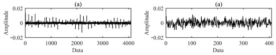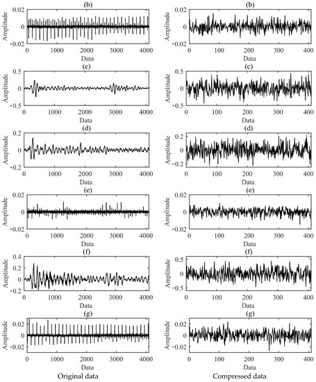 In this study, the compressed data were obtained by constructing a Gaussian random observation matrix and performing random projection compression on it. According to the error of the reconstruction error curve under different compression rates in Figure 5, a compression rate of 10 times was selected to compress the original signal. The time waveforms of AE signals before and after compression for each fault type are shown in Figure 6. It can be found from Figure 6 that the strength of the impact signal carried by the original signal is different. Compared with the original AE signal, the compressed AE signal presents similar random characteristics in the time domain. This is due to the loss of some time-domain features of the signal during the compression measurement process. At this time, the conventional AE signal analysis methods cannot accurately and effectively carry out feature extraction and classification.