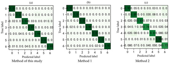 Due to compressed data that shows the randomness of the amplitude, in order to obtain more feature information from the signal, this study used the compressed domain wavelet packet to decompose the compressed signal, and then the component signals of four different frequency bands generated by the signal form four channels as the input of the MF-CNN model. In order to verify the effectiveness of the method in this study, different methods were used for fault diagnosis of RV reducers. Method 1 is that the original signal is directly input into convolutional neural network for fault diagnosis. Method 2 is that the compressed signal directly enters the convolutional neural network for fault diagnosis. Under the condition of the same parameters, the confusion matrix of the predicted label results and the real label results of the test set samples of each method is shown in Figure 7. From Figure 7a, it can be seen that the prediction accuracy of the normal, sun gear tooth root crack, and planetary gear multi-tooth surface wear reached 100%. Figure 7b shows that the prediction accuracy of the failure states of sun gear tooth root crack, sun gear multi-tooth surface wear, planetary gear tooth root crack, and planetary gear multi-tooth surface wear reached 100%. Figure 7c shows that the highest prediction accuracy of the fault state was the planetary gear multi-tooth surface wear, 98% of the planetary gear multi-tooth surface wear was correctly classified, and 1% was wrongly classified as the sun gear multi-tooth surface wear, and the remaining 1% was misclassified as planetary gear single tooth surface wear.