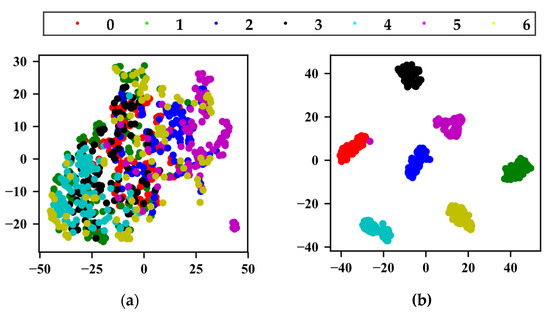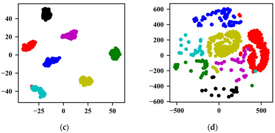 The t-distributed stochastic neighborhood embedding method (t-SNE) proposed by Laurens [30] was used to visualize the features learned by the three different methods. Figure 8a is the dimensionality reduction mapping result of the original data, in which can be seen that the data are disorderly distributed in two-dimensional space; Figure 8b is the mapping result of the last fully connected layer of the method proposed in this study, which showed obvious classification results; Figure 8c is the mapping result of the last fully connected layer of method 1, in which can be seen an obvious classification effect; Figure 8d is the mapping result output from the last fully connected layer of method 2. It can be seen that the basic classification was completed, but the distance between the classes is very small, which does not achieve obvious classification effect.