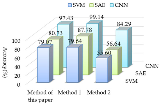 In order to further illustrate the advantages of the proposed method, it was compared with the sparse auto-encoder (SAE) and support vector machine (SVM) fault diagnosis methods respectively. The radial basis function was selected as the kernel function of SVM. The classification features used by the SVM algorithm are 11 eigenvalues, such as RMS, skew, kurtosis, peak, waveform factor, peak factor, and margin. The diagnosis results are shown in Figure 9. It can be seen from the Figure 9, the diagnosis results of CNN are higher than those of SAE and SVN. This study combines CS theory with MF-CNN. While retaining most of the feature information of the original time-domain signal, and then adaptively selecting the frequency band information through the MF-CNN to enhance the weak fault features of the compressed signal, less data can be used to achieve higher classification accuracy. SAE mainly extracts features from the input data and passes them to the decoder to reconstruct the original data. Aiming at the compressed data of the processing object in this study, all the information of the signal cannot be accurately obtained, resulting in the low fault diagnosis and recognition rate of the network. In addition, the performance of the traditional shallow model of SVM largely depends on subjective artificial feature extraction, so its fault diagnosis accuracy and generalization ability combined with the SVM classifier is low.