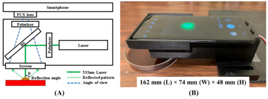 Figure 1 demonstrates the schematic diagram and a picture of the smartphone-based bacterial colony phenotyping instrument. The chassis of the device was built with a black PLA material using a 3D printer (Ultimaker, Framingham, MA, USA). The frame’s inner surface was covered with a non-reflective material to avoid any stray light interfering with the reflection patterns of the bacterial colony. A 5 mW, 532 nm diode-pumped solid-state (DPSS) point laser (#37-027, Edmund Optics, Barrington, NJ, USA) was utilized as the light source. A 50:50 beam splitter (BS) (#31-436, Edmund Optics, Barrington, NJ, USA) was placed to refract the incoming beam towards the bacterial colony. A rear projector film was placed below the BS, a screen material to project the pattern. A 2 mm diameter hole was drilled in the screen and aligned with the laser beam to let the beam travel through the screen, as illustrated in Figure 1A. On the other side of the BS, the smartphone with 12 megapixel imaging sensor was placed to capture the pattern formed on the screen. The smartphone, the Samsung Galaxy S9 model (SM-G960U), provided a manual mode that enabled the manual control of the camera setting, such as exposure, aperture, focus, etc. Therefore, the reflected patterns were collected in the same measurement conditions throughout the experiment. The exposure time, aperture, and ISO were fixed to 1/10 s, f/1.5, and ISO-320. An f = 50 mm plano-convex lens (LA1213-A, Thorlabs Inc., Newton, NJ, USA) was mounted in front of the smartphone camera to adjust the focus. A pair of the polarizers (#54-926, Edmund Optics, Barrington, NJ, USA) was used to minimize the intensity of the specular reflection directly coming from the colony. Because of the specular reflection, the direct reflection of the laser beam caused noise and saturation to the pattern image, a clear pattern was difficult to measure when the smartphone camera, the hole in the screen, and the colony were in perfect alignment. Thus, they were slightly off-axis to prevent the specular reflection from directly illuminating the image sensor. The overall dimension of the device was 162 mm (L) × 74 mm (W) × 48 mm (H), including the smartphone. Additional pictures documenting the components of the proposed instrument are attached in the Supplementary Materials (Figure S1). In Figure 1A, the optical path is illustrated. The incident laser beam is represented with the green solid line, labeled as “532 nm laser” whereas the reflected light from the colony is illustrated by the dotted green line, labeled as “Reflected pattern”. The dashed blue line represents the view angle from the camera. The diagram shows that the smartphone camera views through the beamsplitter and captures the pattern formed on the rear projection screen.