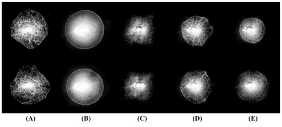 The reflective ELS patterns of the five bacteria grown on BHI with 5% horse blood agar were collected using the proposed device and processed to enhance the contrast of the pattern. After the image processing, patterns were sharper, and their unique characteristics became more apparent. Without the reflective ELS patterns, colonies were not easily differentiable with the naked eye because their morphological characteristics, such as form, margin, and pigmentation were not apparent at the particular size. In Figure 3, the representative pattern images of the five bacteria are presented for qualitative comparison, given in two rows to demonstrate the repeatability. Based on the visual inspection, each species showed unique and distinguishable characteristics in their reflective pattern images. A bright spot at the center is the laser beam spot shown through the hole. Because the hole in the screen was slightly larger than the beam spot and closer to the camera, dark rings were observed around the beam spot. The colonies of E. coli (Figure 3A) and S. enteritidis (Figure 3D) produced patterns with similar-looking shapes with non-uniform patterns at the inner area and noncircular outer edge. However, patterns from S. enteritidis (Figure 3D) demonstrated clear radial spokes, whereas E. coli (Figure 3A) did not show this feature. The L. innocua patterns (Figure 3C) also had irregular shapes, but the peripheral area of its patterns differed from the patterns from E. coli and S. enteritidis (Figure 3A,D); the patterns were not enclosed by borderlines, and the boundary was unclear. The patterns from K. pneumoniae (Figure 3B) were formed with densely packed concentric rings, and had the highest overall intensity, as their colonies were more reflective, resulting in a greater saturated area at the center of the pattern. On the other hand, S. aureus (Figure 3E) also had circular shape patterns, but distinctive patterns were observed in the inner area of the pattern.