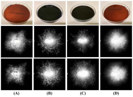 The five bacteria were also plated on BCYE, charcoal, and chocolate agar. Their colonies were interrogated using the proposed instrument to explore the change of reflective ELS patterns with respect to the type of nutrition media. Again, the shape of each reflected pattern was qualitatively compared to observe any differences induced from individual media. The reflective ELS patterns of L. innocua colonies plated on BHI blood agar, BCYE agar, charcoal agar, and chocolate agar are presented in Figure 4 for comparison. The effect of the nutrition media on the pattern’s shape was apparent because the patterns formed differently although they were the same species. On BHI agar with 5% horse blood (Figure 4A), the L. innocua colonies were not uniform or ring type patterns, and diffractions were randomly organized. However, the colonies on BCYE agar (Figure 4B) produced patterns with more definite diffraction lines, while the others were more likely to have randomly scattered light patterns. The patterns from the chocolate agar (Figure 4D) had higher intensity than the others, as most areas of the pattern were saturated. The reflective ELS patterns of the other bacteria grown on BCYE, charcoal, and chocolate agar are also provided in the Supplementary Materials (Figure S3).