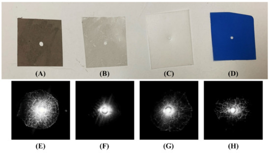 The major innovation from the previous design was that the device’s size was dramatically reduced and it became a handheld detection device. The height of the new device was about 10% of the previous size, which employed a high-resolution DSLR camera, a personal computer, and a large screen to capture the reflective ELS pattern [9]. In the earlier setup, the screen was located above the beam splitter, which led to a longer distance (140 mm) between the colony and the screen. Thus, the reflective ELS pattern on the screen was too large because the DSLR camera had to be 350 mm above the screen. For some colonies, the half cone reflection angle was greater than 45°, which caused the shadow of the beam splitter to interfere with the reflected pattern, and this was unavoidable when the BS was located in between the colony and screen. In the new design, the screen was placed below the beam splitter, close to the colony. The distance between the screen and the camera was also shortened, and the DSLR camera was replaced with a smartphone. The overall height was reduced from 490 mm to 48 mm. Because the screen was in the middle of the laser beam path, a hole was punched in the screen to allow laser beam passage. The hole in the screen did not affect the quality of the delete let patterns because the center of the reflective ELS pattern was a specularly reflected incident beam that saturated the sensor, and the majority of the information lay in the peripheral area. One advantage of integrating the screen and camera was that this was more cost-effective than utilizing an image sensor since the reflective system required a large active area. To select the best screen material, an experiment was conducted with four types of screen material. Two rear projection films with different transparencies and thin diffusive materials with two different colors, gray and blue, were examined. The clearest pattern was formed on the dark rear projection film (Figure 5A), as shown in Figure 5E, while the transparent rear projection film (Figure 5B) could not pick up the pattern in Figure 5F. The patterns formed on the other screen materials were visible but not as differentiated as those on the dark rear projection film. Moreover, they were disturbed by the screen’s texture because the diffusive materials did not have a perfectly smooth surface. Thus, a dark rear projection film was selected for the screen.