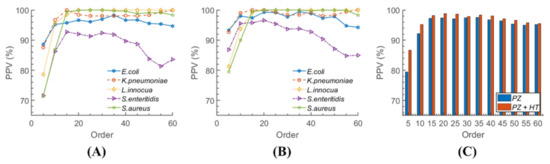 The PPVs of the five bacteria with respect to the pseudo-Zernike polynomial order. The feature set comprises (A) only pseudo-Zernike moments and (B) pseudo-Zernike moments with Haralick textures. (C) Compares average PPVs of each feature set.