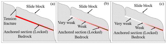 The simulated situation can be interpreted as an advancing layered rock landslide, where the deformation is progressive from the trailing edge of the landslide to the front of the level flattening type cascading rock landslide, meanwhile, a detailed scheme for the evolutionary model of advancing layered rock landslides is presented in the specific work [43,44], as shown in Figure 1, where Figure 1 is a simplified model of a conceptual mechanics model that is designed to give the reader a more intuitive understanding of the landslide triggering mechanism. The gray grid in Figure 1 is the slope surface and bedrock, and the red part is called the anchored section of the landslide, which is the slip zone soil not affected by cyclic loading, but as the landslide evolution stage develops, the red part gradually becomes white, which means that the slip zone soil is affected by cyclic loading and its mechanical strength gradually weakens, and the unaffected part of the slip zone soil gradually becomes less and the safety factor of the landslide gradually decreases, that is, progressively enlarging the weakened upper zone while reducing the size of the lower locking block. The causes of landslides are mainly due to the strain softening rate of the slip zone soil at the trailing edge of the landslide under the cumulative effect of the cyclic loading. Moreover, under the action of long-term tension stress, deep and large tension fractures are produced at the trailing edge of the landslide. The mechanical properties of the trailing edge of the landslide are weaker than that of the leading edge of the landslide, and there is a phenomenon of gradually spreading development from the trailing edge to the leading edge, which means that the trailing edge of the landslide is destroyed first and the leading edge of the landslide is destroyed later. The process of landslide being triggered by cyclic loading has the characteristics of the trailing edge of landslide extruding to the leading edge of the landslide and locking of the leading edge. The evolutionary development of the advancing landslide can be divided into the following stages: (i) tension fractures are formed under the cumulative effect of the cyclic loading, and the fractures develop from the slope to the depth until they cut the underlying soft interlayer, and the tension fractures develop at the trailing edge of the landslide (Figure 1a); (ii) The mechanical structure of the soil in the slip zone at the trailing edge of the landslide is gradually destroyed, and the mechanical strength of the slip zone soil gradually decreases. As the landslide evolution advances, the weakening zone of the slip zone soil also gradually expands toward the leading edge (Figure 1b); (iii) with the expansion of the weakening zone, the length of the landslide locking section decreases accordingly. When the weakening zone expands to a certain length and the landslide resistance is insufficient to resist the sliding force of the landslide, the locking section is sheared out and the landslide is triggered along the penetrating slip surface (Figure 1c).