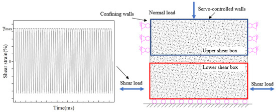 Seismic waves generated by blasting are random waves, and it is better simulated if the original waveform is fed into the numerical calculation model for blasting vibration. However, because of the difficulty of frequency conversion and amplitude variation during the numerical test, all sinusoidal waveforms were used for the input vibration waveforms in the numerical test. In addition, in order to better compare the effects of amplitude and number of cycle loads on slope stability, simple waves were used for all studies in the full paper. At the same time, sinusoidal waves have most of the properties that seismic waves have and also have the advantage of simplifying calculations [48,49,50]. Therefore, after the consolidation phase, the sample was subjected to a strain-controlled sinusoidal cyclic loading pattern. During loading, the volume of the sample was conserved to simulate undrained conditions. The implementation of cyclic loading applied to the numerical model is the key to this simulation. Cyclic loading in laboratory tests is mainly controlled by inputting vibration waves to the test apparatus, while in PFC3D, it is mainly through the definition of wall velocity to achieve cyclic shear loading, which is essentially a displacement-controlled loading method. In the PFC3D simulation, the stress values between the loading wall and the particles are monitored to obtain the shear stress in the soil during cyclic loading. Based on the vibration parameters in the numerical model, a direct shear test is conducted mainly by the lower shear box, and a sine wave is an input to adjust the motion direction of the wall in real time, to achieve cyclic loading of the slip zone soil material. That is, the same shear rate is specified for walls 1#, 2#, 3#, 4#,5#, 9# and 10# in Figure 2. Figure 2 shows a schematic diagram of the cyclic loading process of the numerical model. During the numerical simulation, the PFC3D program mainly includes the measurement of the numerical model shear stress and the application of the wall velocity during cyclic loading. As shown in Figure 2 for the shear box, the force on the lower shear box is the sum of the contact force on wall 8 and the contact force on wall 6, while the force on the upper shear box is the sum of the contact force on wall 9 and the contact force on wall 4, and the number of cycle loading include 750, 1500, 2250, 3000, 3750, 4500, 5250, 6000, 7500, 9000, 11,500, 12,000, and cyclic loading stress amplitude include 0.5 cm/s, 0.9 cm/s, 1.5 cm/s, 2.2 cm/s, where cyclic loading stress amplitude is equivalent to the peak ground velocity (PGV) of a natural earthquake.