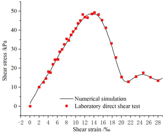 The contact and interaction between numerous particles in a PFC model often exhibits macroscopic mechanical behavior. In order to obtain a suitable set of microscopic parameters matching the particles, the calibration of the numerical model is usually tested by comparing the parameters of the macroscopic mechanical behavior of the numerical simulation with the results obtained in the laboratory [46]. The mechanical parameters involved in PFC3D are fine parameters characterizing the properties of the particles, which have a random nature and a complex relationship with the macroscopic mechanical properties, and the calibrated parameters are generally considered reasonable when the obtained macroscopic mechanical properties are consistent with the actual test results through basic mechanical tests [51]. Therefore, based on the macro-mechanical parameters of slip zone soil, the shear stress-strain curve of the slip zone soil is simulated to find and determine the fine-scale parameters of the shear strength of the numerical model corresponding to the appropriate curve. Combined with the recommendations of the work of Hofmann et al. (2015) on the calibration process of the numerical model [52], the numerically simulated mechanical curves that match well with the laboratory tests are obtained, as shown in Figure 4. Table 1 lists the microparameters related to the slip zone soils.