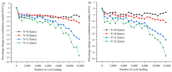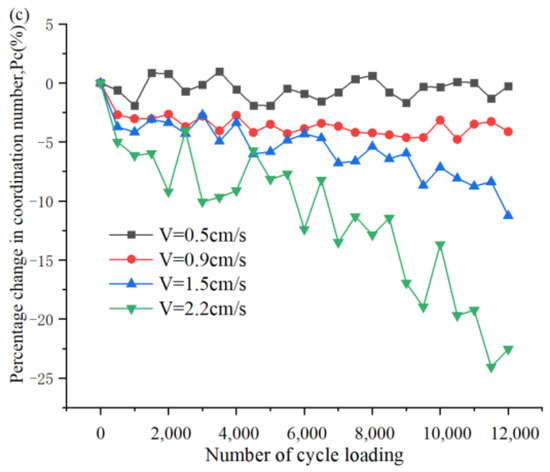 where Cn and Cni are the current and initial coordination numbers in the simulation model, respectively. In the different conditions, the values of Pc of the numerical model are plotted versus the cyclic loading times in Figure 5. In this study, we consider a particle contact breakage rate of 5% (i.e., Pc = −5%) as the maximum limit that can be achieved by particle motion. When the Pc reduction is greater than 5%, significant breakage is assumed. After close observation of Figure 5, when the cyclic loading stress amplitude is 0.5 cm/s, the initial change of Pc does not exceed 10%, which is because this is a small loading rate, which only makes a part of the particles in the numerical soil model move, and even with the increase of cyclic loading, the change of Pc is not significant. Meanwhile, the rate of Pc reduction gradually increased when the cyclic loading stress amplitude increased from 0.9 cm/s to 2.2 cm/s.