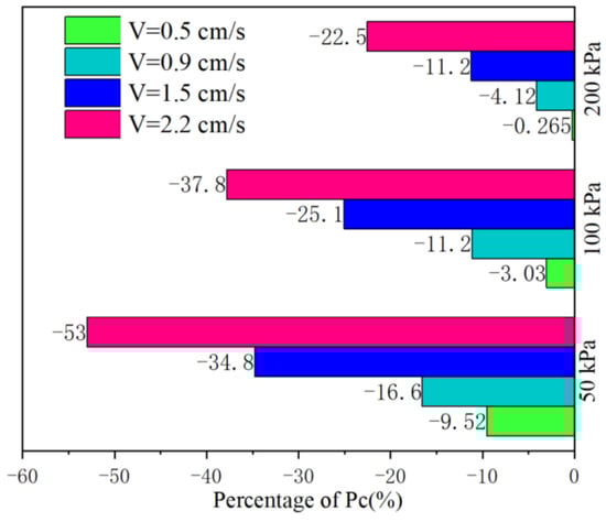 In order to highlight the level of strain softening of the slip zone soil material under cyclic loading, when the number of cyclic loading is 12,000, the 100% stacking bar graph in Figure 6 shows the final Pc estimates for the slip zone soil material under different operating conditions, and their values are indicated separately in the corresponding segments. For example, when the slip zone soil material is subjected to a predetermined confining pressure of 50 kPa, at cyclic loading stress amplitudes of 1.5 cm/s and 2.2 cm/s, it can be seen that the strain softening of the slip zone soil corresponds to Pc values of −34.8% and −53.0% in Figure 6. On the other hand, it is obvious from Figure 6 that the cyclic loading stress amplitude is the main factor controlling the number of fractures generated. When observing the effect of different loading stress amplitudes on the Pc of fractures, i.e., the Pc values at different loading stress amplitudes in Figure 5a–c, it is not difficult to find that the change in the fracture is greatest for loading stress amplitude equal to 2.2 cm/s compared with other cyclic loading stresses, which shows that the soil strain softening effect becomes more pronounced with the increase in the number of cyclic loading at larger cyclic loading stresses. This indicates that the cyclic loading stress amplitude plays a deterministic role in the occurrence of fractures (level of strain softening). On the other hand, as the predetermined confining pressure of the slip zone soil increases, i.e., when the confining pressure of soil increases from 50 kPa to 200 kPa (as observed in Figure 5a,c, the number of cyclic loading is 12,000), it is easy to find that when the loading stress amplitude is 0.9 cm/s, the Pc values are −16.6% and −4.12% respectively, and the above discussion reveals that when the confining pressure is reduced from 200 kPa to 50 kPa (the relationship between the confining pressures values is four times), fractures are four times more easily generated in the 50 kPa model than in the 200 kPa model. However, when observing Figure 6, when the cycle loading stress amplitude increase from 0.5 cm/s to 2.2 cm/s (the relationship between the cycle loading stress amplitude values is almost four times), the multiplication of the increase in Pc values is 5.6, 12.5, and 84.9 for the confinement of 50 kPa, 100 kPa, and 200 kPa, respectively. Therefore, we are able to reach the interesting conclusion that although the confining pressure of the slip zone soil can inhibit the increase of fractures, it has a limited inhibitory effect on strain softening, and it is the cyclic loading stress amplitude that is the most key factor in strain softening process of soil.