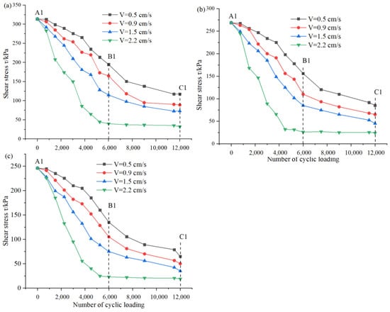Evolutions of shear stress of slip zone soil under different cycle loading in (a) confining pressure = 200 kPa, (b) confining pressure = 100 kPa, (c) confining pressure = 50 kPa.