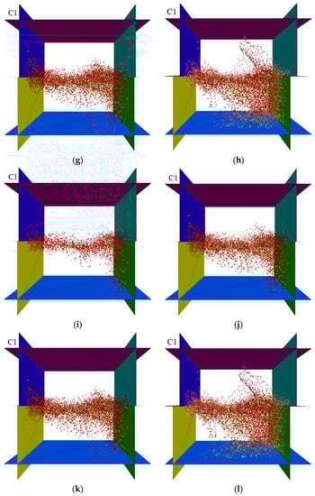 Change of fractures in the numerical model of slip zone soil under different cycle loading in (a–d) confining pressure = 200 kPa, (e–h) confining pressure = 100 kPa, and (i–l) confining pressure = 50 kPa. (a) V = 0.5 cm/s, confining pressure = 200 kPa. (b) V = 0.9 cm/s, confining pressure = 200 kpa. (c) V = 1.5 cm/s, confining pressure = 200 kPa. (d) V = 2.2 cm/s, confining pressure = 200 kPa. (e) V = 0.5 cm/s, confining pressure = 100 kPa. (f) V = 0.9 cm/s, confining pressure = 100 Kpa. (g) V = 1.5 cm/s, confining pressure = 100 kPa. (h) V = 2.2 cm/s, confining pressure = 100 kPa. (i) V = 0.5 cm/s, confining pressure = 50 kPa. (j) V = 0.9 cm/s, confining pressure = 50 kPa. (k) V = 1.5 cm/s, confining pressure = 50 kPa. (l) V = 2.2 cm/s, confining pressure = 50 kPa.