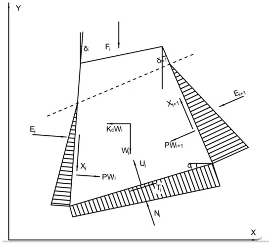 where KcWi is the horizontal seismic inertial force acting on the block. Ti and Ni are, respectively, the shear force and normal force acting on the bottom surface of the block i; Wi is the weight of block i; Xi and Xi+1 are, respectively, acting on the shear force of the block i side and the i + 1 th side; is Ei the normal forces acting on the block i side, and Ei+1 is the normal forces acting on the block i + 1 side; Fi is the external load acting on the top of the slope; the angle between the block i side and the vertical direction is δi, the angle between the block i + 1 side and the vertical direction is δi + 1 the angle between the sliding surface of the block i and the horizontal direction is αi;