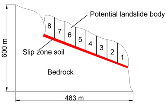 The section of the slope with slip zone soil is selected as the research section, as shown in Figure 1, in which it is assumed that the slope is a laminated structure, the thickness of the slip zone soil is relatively uniform, and the shear strength parameters of the soil material in the slip zone at different places are the same. In order to reasonably analyze the relationship between the shear strength of the slip zone soil and slope stability, the change of slope stability is discussed and analyzed under different numbers and stress amplitude of cyclic loading. Figure 10 shows a schematic diagram of a section of the slope with the slip zone soil. The sliding section examined includes the slip zone soil, the unloading boundary line and the bedrock. The potential landslide body is divided into strips, and the potential landslide body is divided into eight vertical strips. The cohesion of the potential landslide body and bedrock is 466 KPa and the internal friction angle is 29°, meanwhile, the cohesion between strips from bar 1 to bar 8 is 400 KPa and the internal friction angle is 25°. To simplify the calculation process, the strength parameters of bars 1–8 adopt the uniformity value, the strength parameters of the slip zone soil are the data obtained from the above Section 3.2.