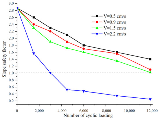 Therefore, two possible landslide triggering mechanisms are described. For mode 1, by analyzing A1 and A2 in Figure 8a–c,e–g,i–k, the shear stress gradually decreases with the increase in the number of cyclic loading, and the fracture is also gradually expanded into a penetrating fracture zone, that is, the strain softening behavior occurs slowly with cyclic loading. Additionally, the same analysis applies to the stability coefficient of the slope when cyclic loading stress amplitude is less than or equal to 1.5 cm/s in Figure 11. On the other hand, model 2 can be easily obtained by analyzing A3 in Figure 8d,h,l, it can be seen that when the shear stress no longer increases with the number of cyclic loading, the number of fractures still continues to increase, indicating that the landslide has been triggered. Mode 2 shows that when the cyclic loading stress is larger, the shear stress in the slip zone soil tends to decay rapidly as the number of cyclic load loading increases. Therefore, this phenomenon infers that if the amplitude and number of cycle loading stress are large enough, the strain rate of the slip zone soil will gradually accelerate and a large shear fractures zone is likely to occur, followed by a landslide occurrence, which means that the strain softening behavior of slip zone soils is the result of inertial forces, which expand at a very fast development rate, which is also verified by the data in Figure 11 that is equal to 2.2 cm/s.