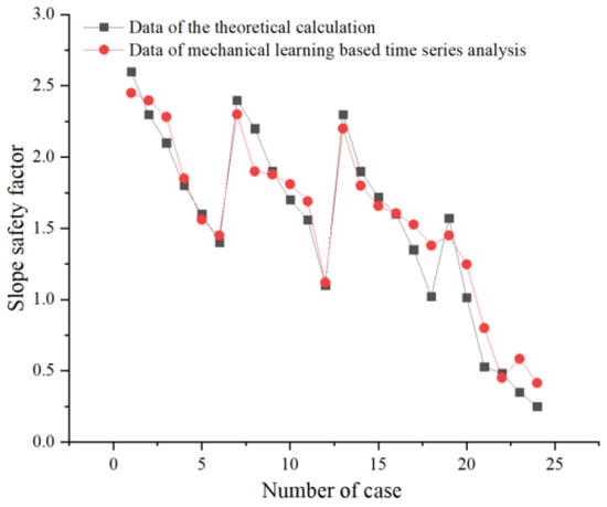 Therefore, this model is a suitable model, so the data in Table 2 are modeled and predicted according to this validated model, as shown in Figure 12. It is easy to see through Figure 12 that the stability coefficients of slopes under different load cases are well predicted, while the difference error between the two is very small. This model can be used for the prediction of stability coefficients of slopes, and also provides an accurate and efficient mechanical learning method for stability analysis of slopes under cyclic loading.