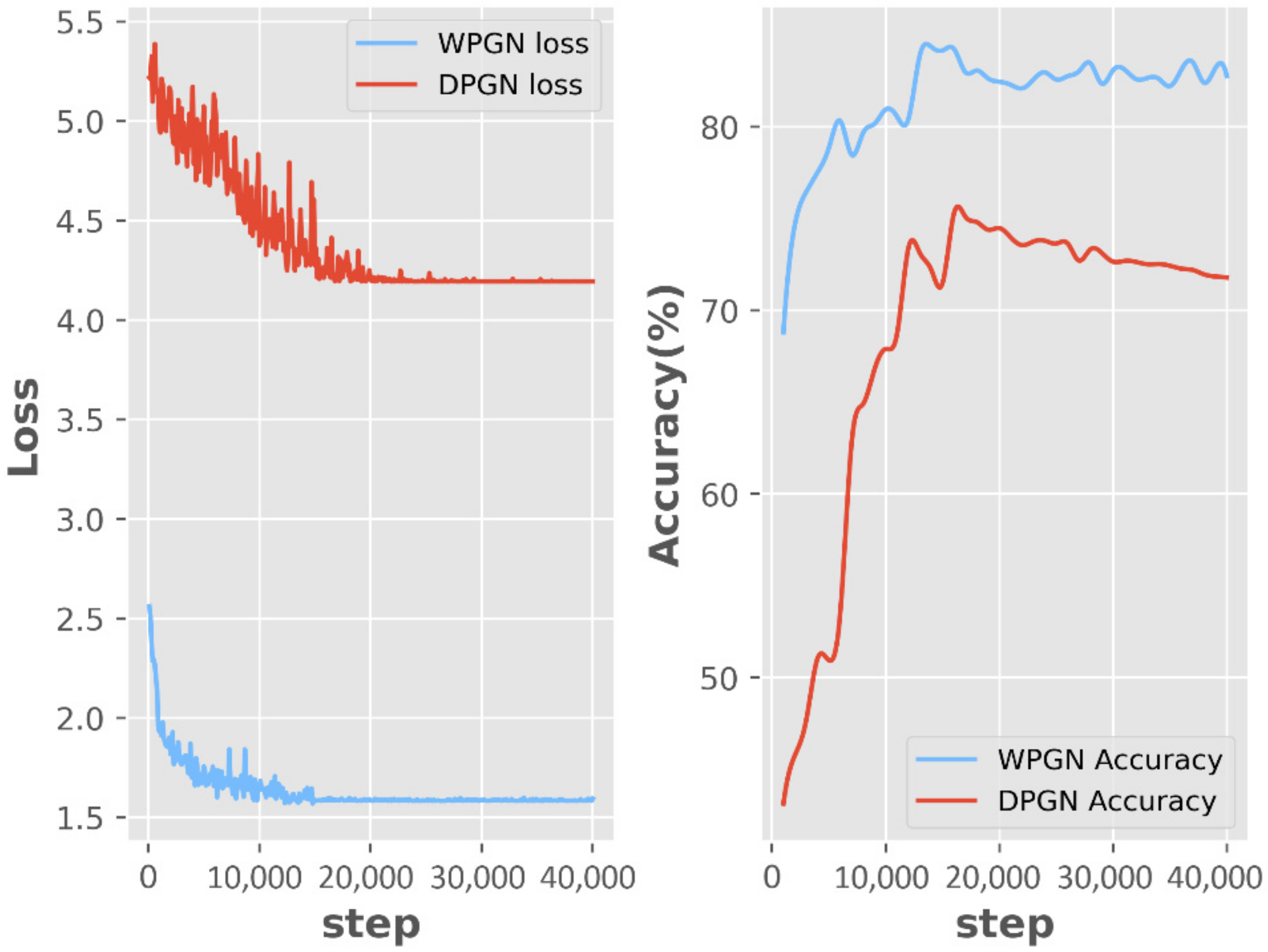 Figure 10, the loss convergence speed of WPGN is significantly faster than that of DPGN, which shows that the WPGN is better in total training time. We found that WPGN converged in 12,000 rounds. Hence, we reduced the learning rate for further optimization. DPGN requires at least 15,000 rounds to converge such that the learning rate can be reduced. We tried to reduce the learning rate for DPGN at 12,000 rounds, but experimental results show that the accuracy of DPGN was reduced by ~2%. The right side of