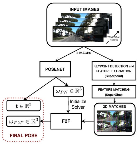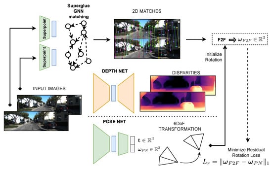 Therefore, in this work, we present RAUM-VO. Our approach, shown in Figure 1, combines unsupervised pose networks with two-view geometrical motion estimation based on a model-free epipolar constraint to correct the rotations. Unlike recent works [15,16] that train optical flow and use complex or computationally demanding strategies for selecting the best motion model, our approach is more general and efficient. First, we extract 2D keypoints using Superpoint [17] from each input frame and match the detected features from pairs of consecutive frames with Superglue [18]. Subsequently, we estimate the frame-to-frame motion using the solver proposed by Kneip et al. [19], which we name F2F, and use the rotation to guide the training with an additional self-supervised loss. Finally, RAUM-VO efficiently adjusts the rotation predictions with F2F during online inference, while retaining the scaled translation vectors from the pose network.