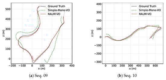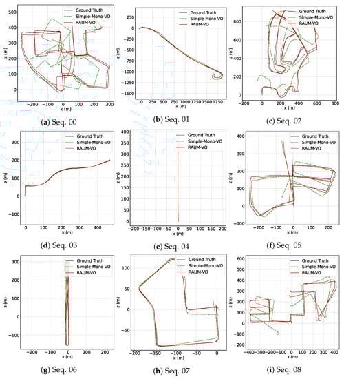 While RAUM-VO does not surpass DF-VO performances in many sequences, its accuracy is comparable while being more efficient. Because DF-VO is one of the most promising hybrid approaches using monocular images for the VO, in Section 6.2, we examine the differences and advantages of our method in more detail. Regarding traditional methods, the average error of RAUM-VO is generally lower, except for the metric computed on ORB-SLAM only. However, unlike ORB-SLAM, we do not apply local BA. Regarding the unsupervised pose networks category, the proposed RAUM-VO proves to reduce the error effectively with the proposed rotation adjustment step. In the link (https://youtu.be/4woTiJRCrUI, accessed on 10 February 2022), we provide a video that shows the depth map predictions for all the KITTI sequences.