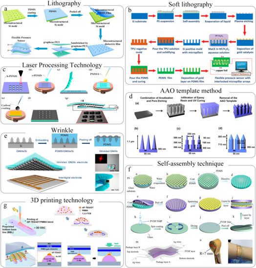 Self-assembly technology is a low-cost micro-nano-processing technology that can prepare microstructures in a large area. Wong et al. used monodisperse polystyrene (PS) microspheres to self-assemble into a single-layer and ordered sacrificial template. By pouring PDMS solution onto the template and removing the PS microspheres after solidification, a flexible substrate with microsphere structure can be obtained [107]. The size of the microstructure in this flexible sensor can be changed by adjusting the size of the PS microspheres. The resulting micro-structured thin film was coated with a gold layer by magnetron sputtering and then aligned the packaging. The sensitivity of the as-prepared flexible piezoresistive sensor can be as high as 15 kPa−1. Moreover, this sensor has been successfully applied to measure human neck pulse, showing a wide range of application prospects in human health monitoring. Similarly, the research group used the same PS microspheres to self-assemble into a single-layer sacrificial template. After microstructure replication and transfer, a flexible PDMS substrate with microstructures was obtained. The surface of the PDMS substrate microstructure was sprayed with gold, and the thin PVDF film acted as a dielectric layer (Figure 2f), which integrated a flexible pressure sensor [73]. This sensor with excellent flexibility and sensing performance (sensitivity: 30.2 kPa−1) can monitor various human motion signals and physiological signals, which has great application potential in the wearable field. Self-assembly technology has obvious advantages (low cost and easy large-area preparation of microstructures), but its disadvantages are also obvious. Successfully prepared microstructure templates usually can only be used once, and the template utilization efficiency is low.