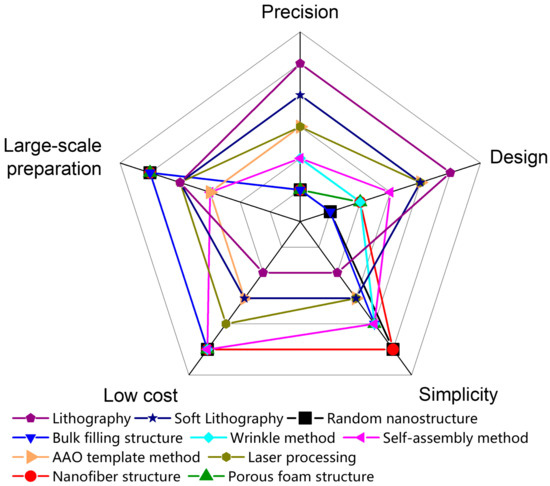 Figure 5 compares the performance of various force-sensitive interface microstructure preparation methods in terms of precision, design, simplicity, low cost, and large-area fabrication. For example, photolithography can design the required microstructures and prepare the microstructures with high precision, but it requires expensive specialized equipment and undergoes more complicated procedures. The preparation of random microstructures has low requirements on templates (animals, plants, sandpaper, etc.), which is easy to produce and has a low production cost, but the precision of the obtained microstructure is low due to the randomness of the microstructure. Generally, researchers can freely choose a suitable microstructure preparation method according to Figure 5.