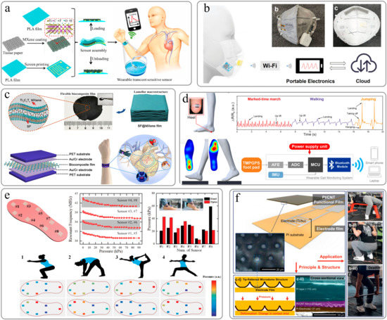 Pulse detection and respiratory rate monitoring are essential for the diagnosis of many diseases, such as cardiopulmonary problems, sleep disorders, and asthma. Placing the sensor on the fingertips, wrist, or carotid artery can measure the pulse beat, and placing the sensor under the chest or nose can be used to measure breathing-related deformation. Li et al. designed an ultra-thin flexible piezoresistive sensor with high sensitivity and wide detection range based on pressure-sensitive materials with hierarchical nanonetwork structure and nanonetwork electrodes [133]. The superior sensing performance with the ultra-thin feature and nanonetwork structure provides a high degree of skin fit for the pressure sensor. These superior performances lay the foundation for the application of pressure sensors in physiological signal monitoring and pressure spatial distribution detection. Chang et al. used a hybrid nanonetwork combined with biomaterials as the interface conductive layer of the contact resistive pressure sensor [134]. By effectively modulating the interlayer resistance, the piezoresistive response was significantly improved, and good stability was provided. The developed flexible sensor can monitor the wrist pulse wave under the external moderate pressure level in real time. Guo et al. sandwiched porous Mxene-impregnated tissue paper between a polylactic acid (PLA) sheet and a polylactic acid sheet coated with interdigital electrodes to make a highly sensitive, flexible, and degradable pressure sensor [135]. The sensor can be used to predict the patient’s potential health status and as an electronic skin (E-skin) to map tactile stimuli. It has great potential in personal health monitoring, clinical diagnosis and next-generation artificial skin (Figure 6a). Guan et al. proposed a bio-inspired resistive pressure sensor based on gradient porous materials, which can measure pressures from 20 Pa to 1.2 MPa [136]. The sensor has been successfully used to detect wrist and jugular pulse signals due to its rational structural design and fine material property engineering. Yang et al. demonstrated a novel flexible paper-based pressure-sensing platform, which is characterized by Mxene-coated tissue paper (MTP) sandwiched between a polyimide encapsulation layer and printed paper with interdigitated electrodes [137]. The flexible pressure sensor is integrated with the signal processing and wireless communication module on the mask to be used as a remote breathing monitoring system to wirelessly detect various breathing conditions and breathing abnormalities (Figure 6b). Dongyi Wang et al. demonstrated a flexible silk @Ti3C2Tx MXene (SF@MXene) biocomposite membrane with a three-dimensional cross-linked structure, using natural silk (SF) as a bridging agent to self-assemble two-dimensional (2D) MXene nanosheets into a continuous wave-shaped-layered macrostructure [92]. The pressure sensor can be applied to human health monitoring, including pulse sensory analysis, sound, swallowing, finger movement, etc. (Figure 6c).