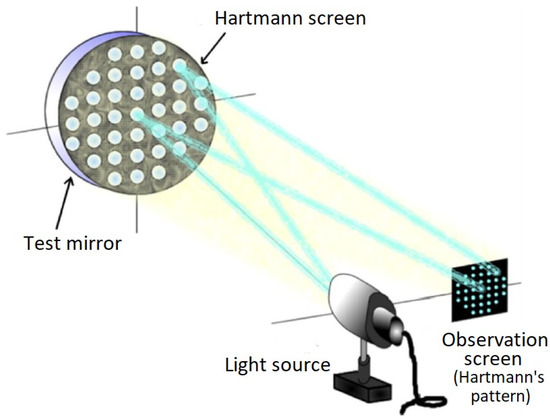 Currently, Hartmann’s test is used to measure the wavefront or shape of an optical surface [38]. The basic setup of the Hartmann test is shown in Figure 2. The aspherical wavefront diverges from the light source and heads towards the test mirror, but before reaching the mirror it encounters the Hartmann screen, which lets only a few light beams pass (one for each hole on the screen). The rays that manage to pass are reflected into the mirror and sent back through the same holes of the Hartmann screen. These rays finally arrive at the observation screen, which can be an opaque screen, a photographic film, or a Charge-Couple Device (CCD) sensor of a video camera, where the Hartmann pattern (which is a dot diagram) is recorded. Once the Hartmann pattern is obtained, the next step is to measure the wavefront or the wavefront aberration. This can be achieved by measuring the point positions of the Hartmann pattern generated from a test mirror. These positions are then compared with the point positions of the Hartmann pattern generated by a reference mirror.