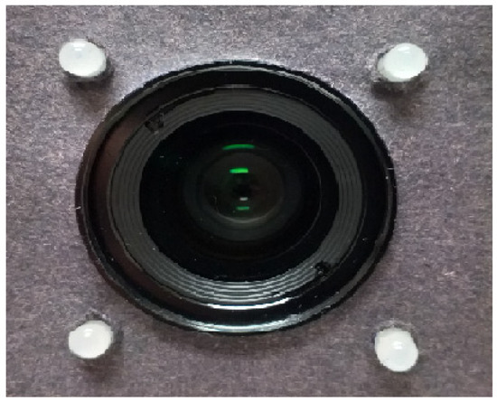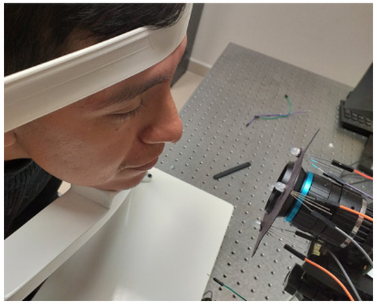 A modified prototype was built based on the device described in the article submitted by Jean-Cyriaque Barry et al. [39]. A quadrangular array of LEDs was used instead of three-lined sources since a linear array would not provide enough information to describe the wavefront (the LEDs had a 5 mm diameter, with a pulse width of 440–480 nm and 580–640 nm, a 12° viewing angle, and maximum output power of 25 mW to avoid human eye damage). As mentioned, the quadrangular array of LEDs was designed to illuminate the test subject’s right eye, aligned with a varifocal lens and a C-MOS camera (12.3-megapixel SONY IMX477 sensor, pixel size), which captures the Purkinje images produced by the light source. The use of a quadrangular arrangement has some advantages over the linear array used in the work on which this investigation is based. For instance, it has a symmetrical shape, which easily allows the identification of the Purkinje images (PIV is inverted concerning the PI image). Furthermore, the geometric pattern can be used to reconstruct the wavefront of the system being analyzed. The constructed instrument was mounted on a base that carries a chin and forehead rest designed to hold the subject’s head steady during measurements; Figure 4. In this setup, the PII is not visible because it is very close to the PI and the PI covers the PII. Furthermore, the PIII is not visible since the image is subjected to pre-processing that highlights the edges (especially those of the pupil) and noise reduction that removes the PIII from the eye.