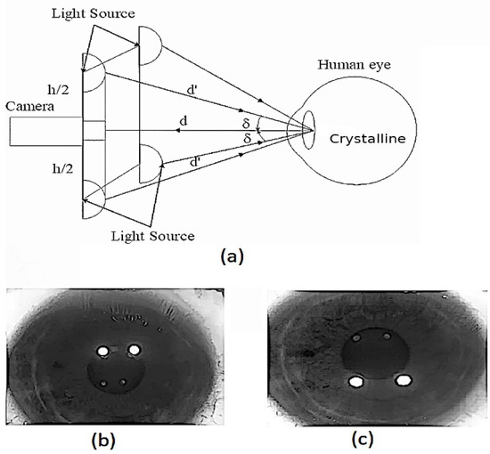 Schematic representation of a prototype setup for Purkinje IV reflection pattern evaluation with light sources pointing at the eyes from above. (a) The light sources are separated by the distance, and , from the camera. In this setup, and form an angle . that allows us to see the Purkinje images (PI and PIV). (b) Results obtained when used to impinge on the light source placed on top. (c) Results obtained when used to impinge on the light source placed below.