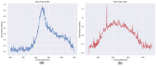 Normalized spectra of LEDs with different pulse widths: (a) Blue light source (440–480 nm) and (b) red light source (580–640 nm).