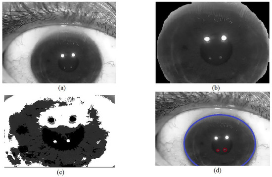 Segmentation process once the PIV image of Purkinje is formed: (a) image obtained from the wave-front sensor; (b) iris zone segmentation; (c) applying a threshold and noise removal algorithm to eliminate unwanted areas in the image; (d) detection of PIV in the pupil area.