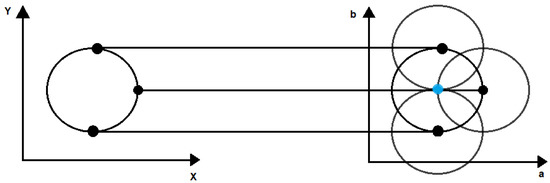 Purkinje images are visible on the pupil as shown in Figure 7a. However, the Hough transform was applied to extract the section of the image that corresponds to the iris of the eye and eliminate the rest of the image content obtained by the camera [41]. This prevents the detection of false reflections generated by other parts of the human eye (tear film). The Hough transform was selected since it is an algorithm used for feature detection (including lines and circles) in a digitized image [42]. According to the Hough transformation for circles, each pixel in the image corresponds to a circle in Hough space. All the points of circle in the image are transformed into several circles with the same radius , where their intersection, , is the center of the detected circle, as represented in Figure 8. The Hough transform results are stored in a matrix known as the Hough accumulator. The accumulator values are updated for each circle generated using the Hough transform. The center of the detected circle is the maximum value generated in the accumulator circle (where circle represents the area of the iris). Once the iris area is extracted (Figure 7b), the next step is to find PIV. This is required to establish the thresholds that allow PIV to be highlighted and eliminate PI. In the image of the eye (Figure 7c), PIV has an intensity ranging between 0 and 100 pixels, whereas PI has an intensity ranging between 200–255 (in grayscale); these thresholds highlight PIV. Finally, applying the Hough transform again, but now to find a smaller radius, we can obtain the form of the PIV (as represented in Figure 7d). Finally, to obtain the center point within the PIV, we can calculate the centroids by adding all the positions of the pixels and dividing them by the total number of pixels found by the Hough transform. These centroids are used to calculate the difference generated by each pattern and, subsequently, to calculate the LCA using the Zernike polynomials.