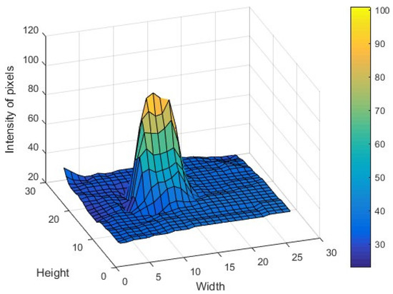 Figure 9 shows the intensity of the spot on the last crystalline lens layer. To determine the position of the spot, we use Hough’s algorithm, which is widely used in the detection of shapes such as the iris and the pupil [48,49]. The light distribution of the spot depends on the wavefront within the lens aperture. Since the wavefront function does not change within the aperture lenslet, it can be expressed in a few terms of the Zernike polynomial, which consist of the local inclinations, the defocus, and the astigmatisms values. The local tilt terms vary proportionally according to the focal point of the camera lens, while the defocus term will change the light distribution. However, the central point of light distribution will not vary. By comparison, the camera lens is small enough that high order aberrations can be ignored, and the centers found in the light distribution will provide an adequate image for estimating the position of the spot. One of the advantages of the Hough transform is its ability to locate the centroids in different intensities, which allows greater accuracy when measuring slopes. Such accuracy is difficult to achieve by any other method.