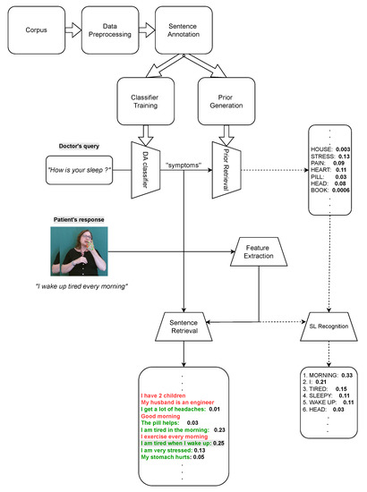 To achieve this goal, we modeled the context of the doctor-patient dialogues based on a hierarchy of dialogue acts (DA) [39], and we predict the expected vocabulary of the patient’s response to optimize the SL-to-text translation process. The task of SL-to-text translation is very challenging and typically requires computations over large vocabularies. Our approach aims to increase the quality of the translation by assigning greater probabilities to certain vocabulary terms, given the current context of the interview.