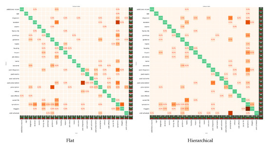 Confusion matrices of the flat (left) and hierarchical (right) classifiers. Reprinted with permission from [14]. Copyright 2021 Association for Computing Machinery (ACM).